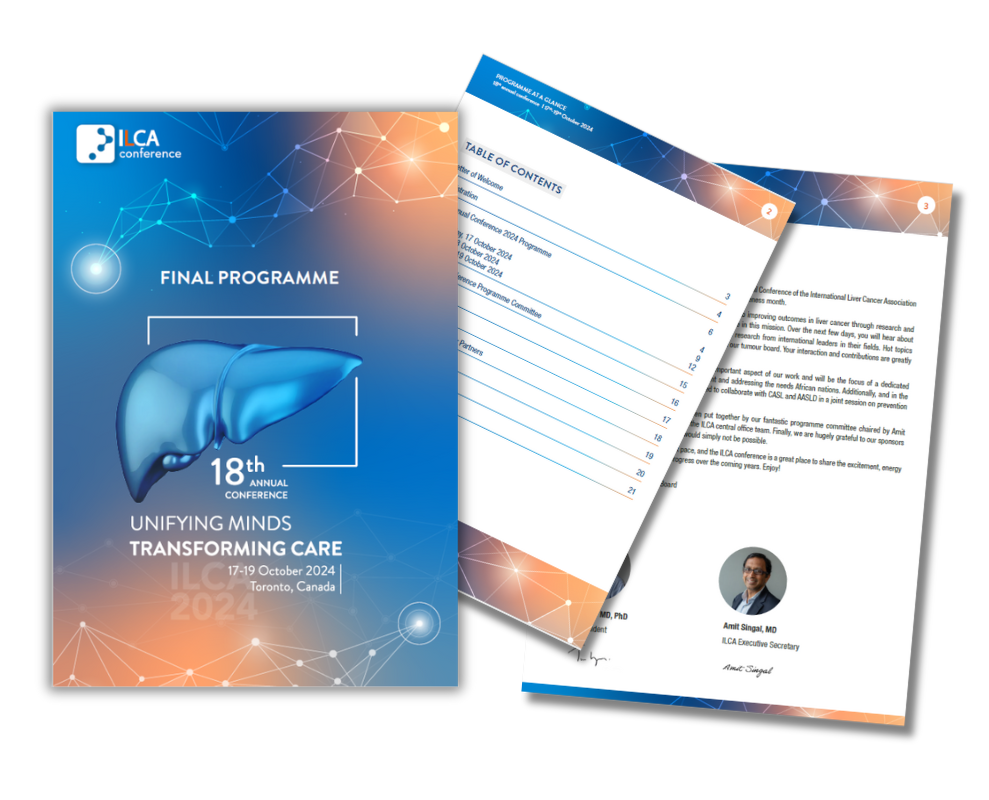 The ILCA AC 2024 program will include the most relevant topics in the field of liver cancer from bench-based basic and translational research to bedside clinical management for patients with hepatocellular carcinoma (HCC) or cholangiocarcinoma (CCA). Sessions will cover the most recent science and advances in screening, diagnosis, and treatment, including surgery, locoregional therapies, systemic agents, and symptom management for patients with liver cancer.